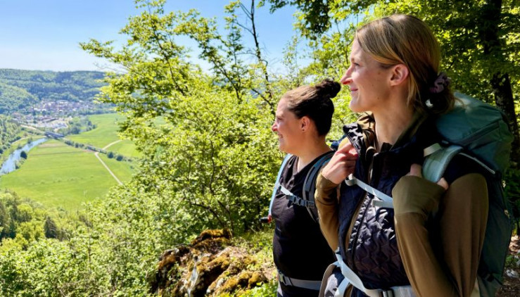 Was kann man auf dem Donauberglandweg alles sehen und erleben? Die Reporterinnen vom SWR Instagram-Kanal Outdoorliebe, Diana Beckmann (li.) und Sarah Meyer-Hübner (re.), machen den Test.