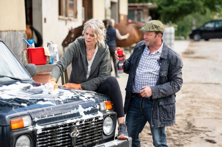 Nach einer verlorenen Wette mit Bernd (Martin Wangler) muss Kati (Christiane Bachschmidt) dessen total verdreckten Wagen putzen.