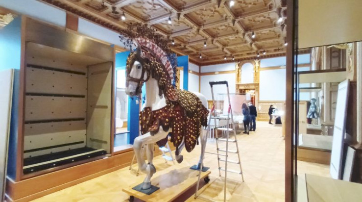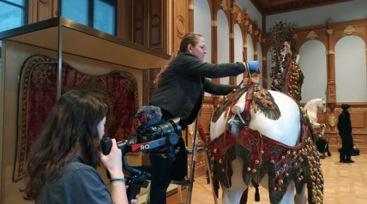 Mit dem Großen Ballsaal und dem Propositionsaal ist nun der historische Rundgang auf der Festetage des Schlosses komplett. Die neue Dauerausstellung "Masken und Kronen" erzählt darin von Machtgebaren und Festkultur der sächsischen Kurfürsten. Zu sehen ist auch ein kostbares Zaumzeug für Pferdeschlitten von 1719 - drapiert auf einem extra dafür geschnitzten Holzpferd. Genutzt hatte es der Sohn August des Starken, um seine Auserwählte, eine Kaisertochter in Wien, bei einer Schlittenpartie zu beeindrucken. Stefanie Penthin hat die 17 Einzelteile über anderthalb Jahre gemeinsam mit ihren Kollegen restauriert und ist gespannt auf die Wirkung des atemberaubenden Ensembles in Rot und Gold in den neuen Sälen.