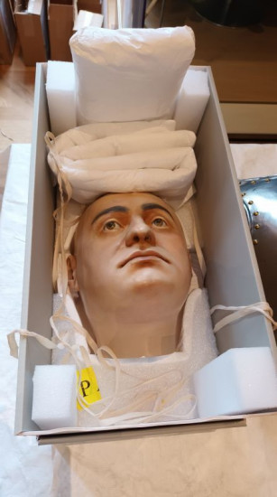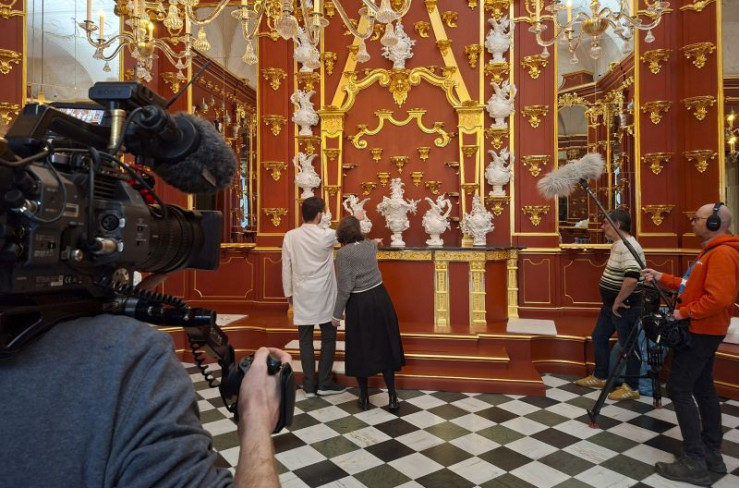Kamerateam zeichnet Einräumen des Porzellankabinetts auf.