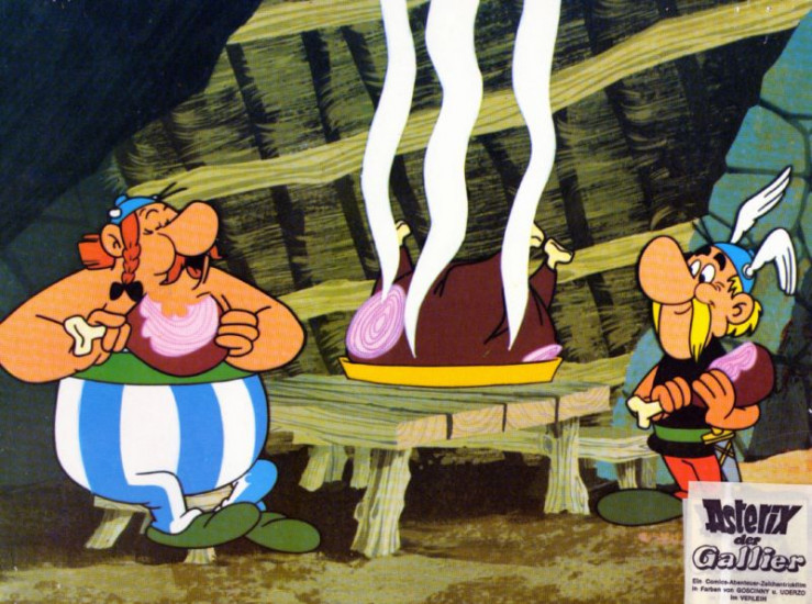 Aster (re.) und Oberlix (li.) lassen es sich schmecken. Noch wissen sie nicht, dass die Römer ihnen auflauern.