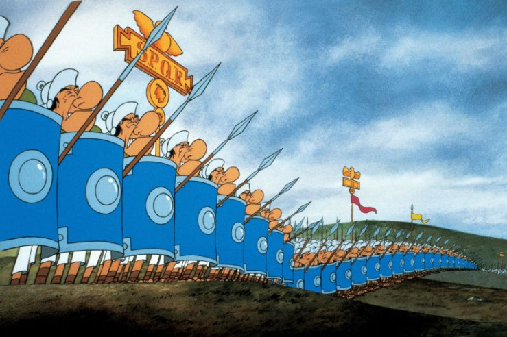 Asterix (vorne, li.) und Obelix (vorne, re.) unterstützen ein kleines Dorf in Britannien im Kampf gegen Cäsar und dessen Armee.