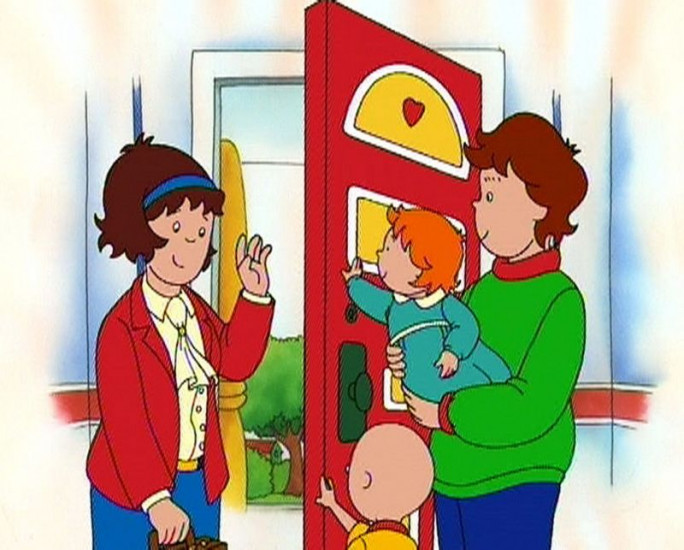 Mami verabschiedet sich von Papi, Caillou und Rosie.