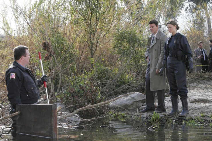 Booth (David Boreanaz) und Brennan (Emily Deschanel) untersuchen den Tatort, an dem eine Frau - ohne Knochen und in einer Kiste verpackt - im Fluss gefunden wurde.