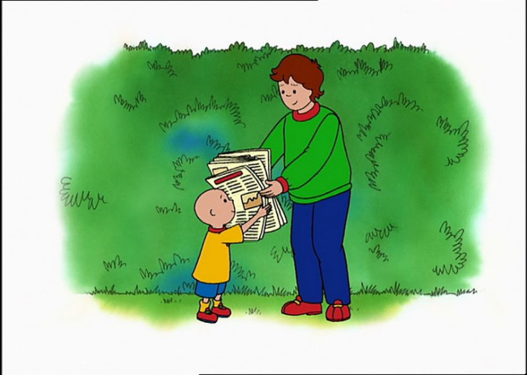 Wie an jedem Wochenende holen Caillou (l.) und Papi (r.) die Zeitung herein. Caillou freut sich schon auf seine Lieblingsseite, die Comics. Doch der Wind macht ihm einen Strich durch die Rechnung...