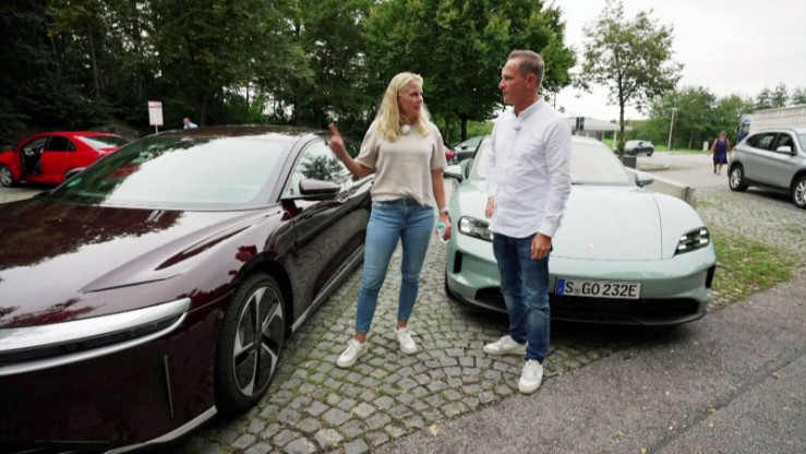 Matthias Malmedie und Laura Kraihamer testen den Lucid Air Pure RWD gegen den Porsche Taycan. Sie vergleichen Ladedauer, Reichweite und Sportlichkeit.