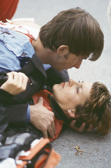 Kommissar Schuster (Klaus Wennemann, unten) und der Sanitäter Peter Berger (Serge Falck) versuchen sich vor der Explosion zu schützen. +++ Die Verwendung des sendungsbezogenen Materials ist nur mit dem Hinweis und Verlinkung auf RTL+ gestattet. +++