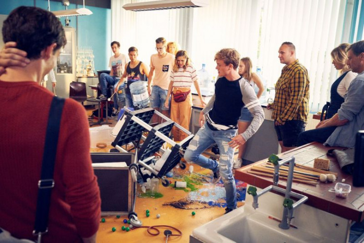Clemens (Fabian Jaray, Mi.) ist taub. Ihm ist an seinem ersten Schultag alles zu viel. Er zerstört den Chemieraum. Der G-Kurs (v.l.: Melodie Wakivuamina, Loic Lopes, Jan Liem, Taynara Wolf, Yvonne Pferrer) ist geschockt.