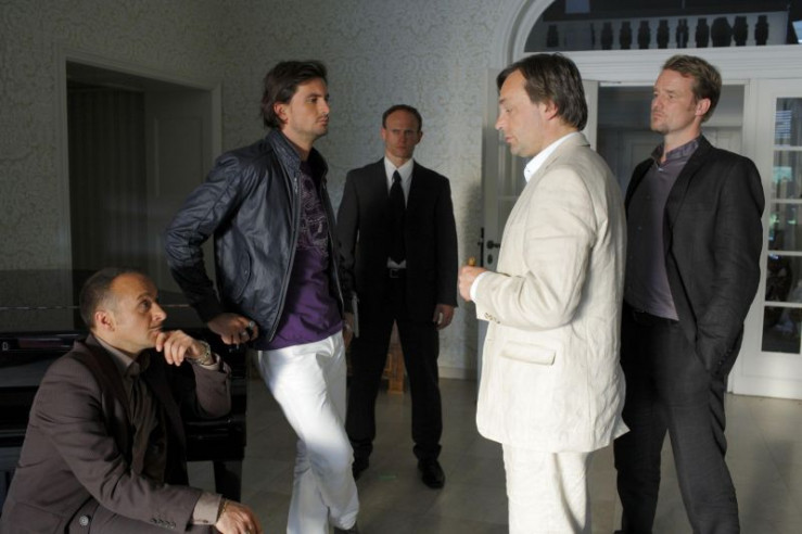 Mithilfe eines Koffers voller Heroin gelingt Semir (Erdogan Atalay, li.) und Ben (Tom Beck, 2.v.li.) die Kontaktaufnahme zu den Männern des Drogenkartells, Wulff (Peter Benedict, 2.v.re.), Becker (Holger Doellmann, re.) und ihrem Schergen (Thorsten Sarazin, hi.).