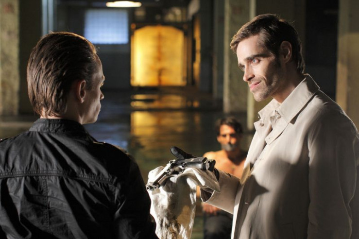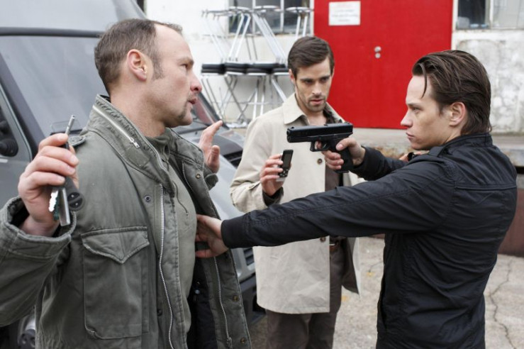 Marc Enders (Wolfgang Menardi, r.) präsentiert Dennis (Vinzenz Kiefer, l.) Fashat (Murat Seven) als Jimmys Mörder und bietet Dennis an, Fashat zu töten...