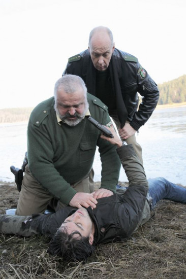 Herzberger (Dietmar Huhn, l.) und Bonrath (Gottfried Vollmer) haben den scheinbar leblosen Ben (Tom Beck, lieg.) aus dem Wasser gezogen und wollen ihn wiederbeleben. Doch auf die Mund-zu-Mund-Beatmung will Ben gerne verzichten...