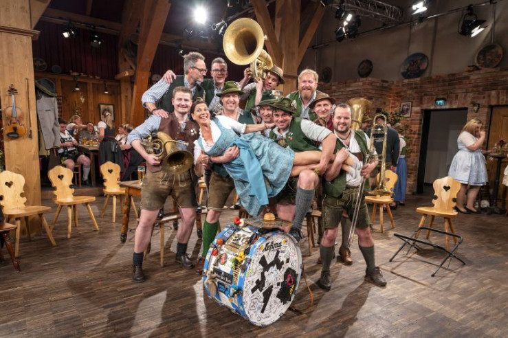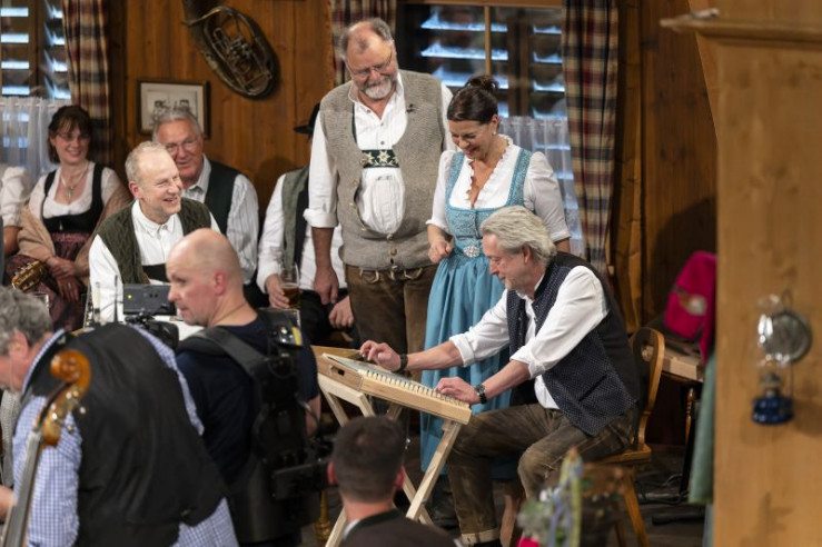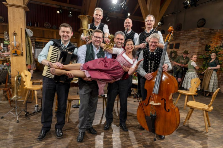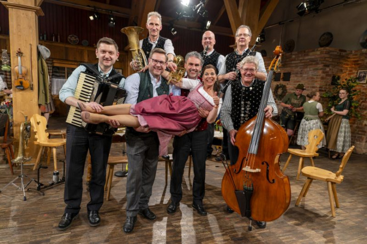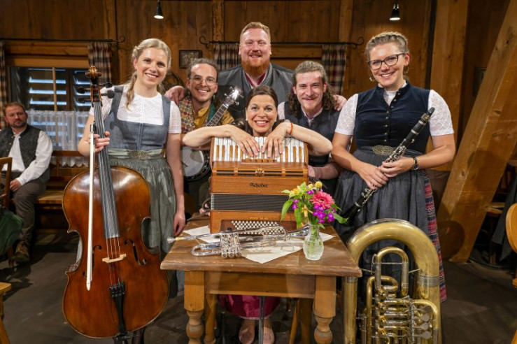 Die Hallgrafen Musikanten mit Traudi Siferlinger (Mitte) und Dominik Glöbl (hintere Reihe, 2. von rechts).