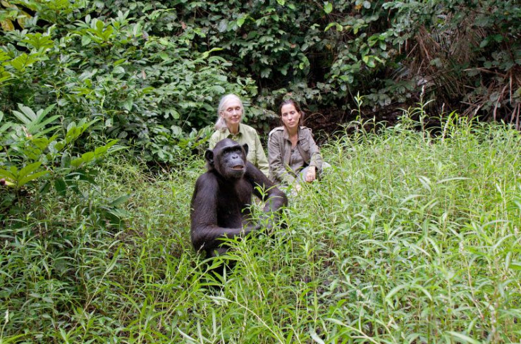 Jane Goodall (li.) und Rebeca Atencia (re.), Managerin des Jane Goodall Institute (JGI) im Kongo, beobachten Wounda bei ihrem ersten Freigang.