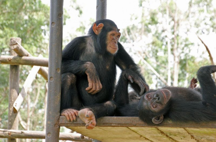 Motambo macht eine Pause bei einer benachbarten Schimpansen-Gruppe.