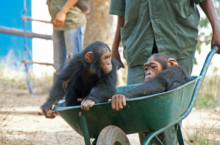Die Schimpansen JJ und Lemba werden in einer Schubkarre transportiert.