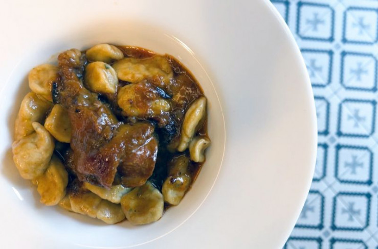 Pula, Kroatien: Igor serviert Hähnchenfleisch aus dem Schmortopf und hausgemachte Gnocchi.
