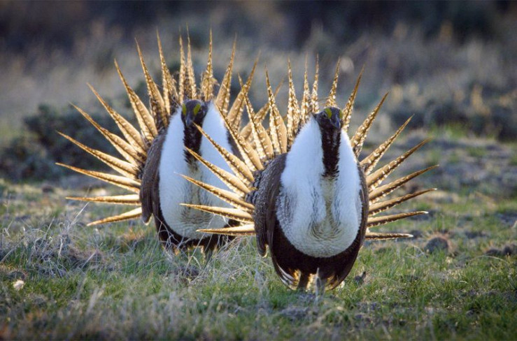 Zwei männliche Beifußhühner bei der Balz.