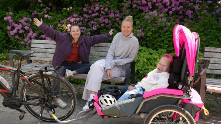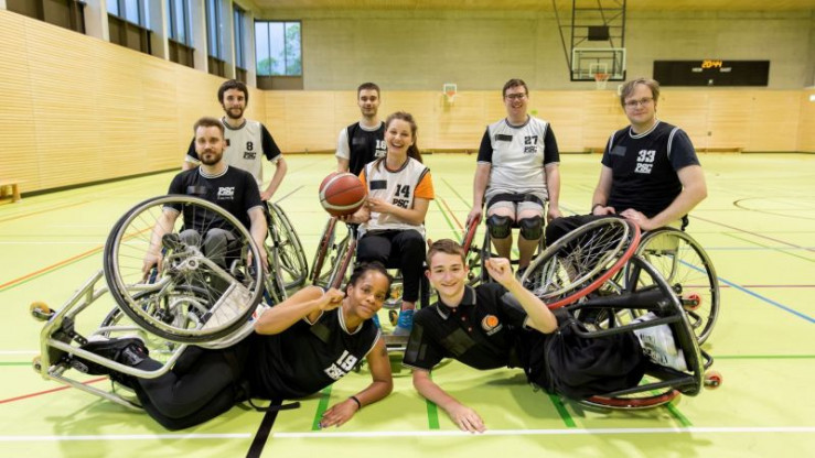 Checkerin Marina (Mitte) trainiert Rollstuhl-Basketball mit dem PSC Pforzheim.