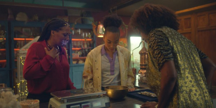 Ceces Mutter Lizzie (Malou Beauvoir, links), Cece (Hailey Romain, Mitte) und ihre Tante Ginger (Raven Dauda, rechts) wollen mehr über die Pläne der Mystics herausfinden. Dazu löst Cece den Schweigezauber, der Lizzy auferlegt war und der sie daran gehindert hatte, Cece mehr über die Vergangenheit zu erzählen.