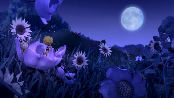 Gleich in ihrer ersten Nacht schleicht sich Maja - vom sanften Mondlicht angezogen - zusammen mit Willi aus dem Bienenstock. Der ängstliche Willi würde am liebsten die Augen schließen. Maja hingegen kann sich an den Farben der Nacht nicht sattsehen. Ihr Wunsch auf der Wiese leben zu wollen wird immer stärker. Selbst ein hungriger, großer Frosch kann sie davon nicht abbringen.