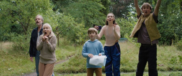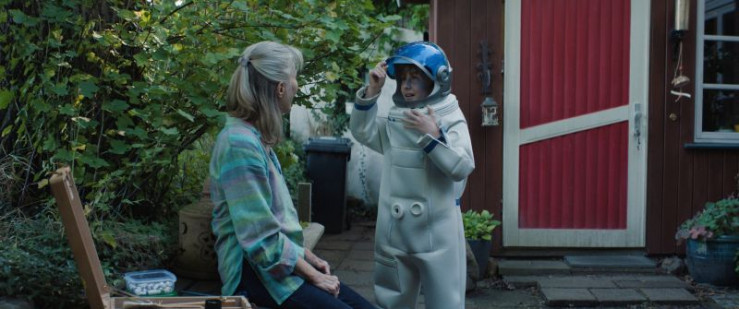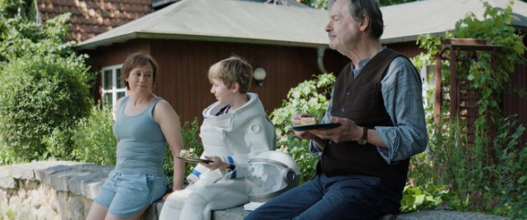 Tom (Theo Kretschmer), seine Schwester Nina (Lilli Lacher) und Mutter Vera (Eva Löbau) kommen bei den Großeltern zu Hause in Lunau an. Tom trägt dabei seinen Astronautenanzug und Helm.