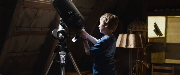 Tom (Theo Kretschmer) ist auf dem Dachboden und richtet das Teleskop aus.