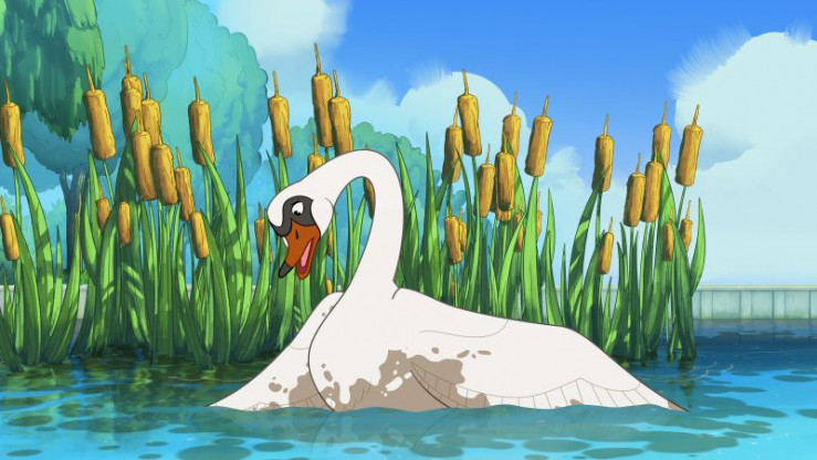 Schwan Hokuspokus erschrickt. Es klebt etwas an seinen Feder, das ihm das Schwimmen erschwert.
