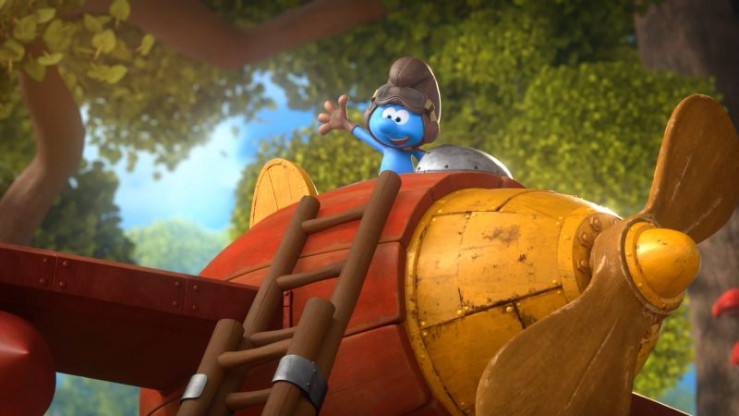 Papa Schlumpf gibt Handy heimlich eine magische Fernsteuerung für das Flugzeug.