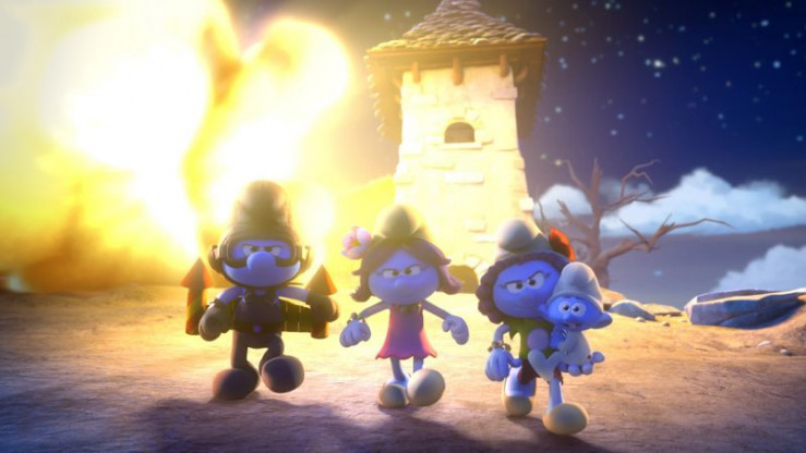 Poppy, Blüte, Baby und Handy verlassen Gargamels Schlupfwinkel, nachdem sie ihn erneut in seine Grenzen gewiesen haben.
