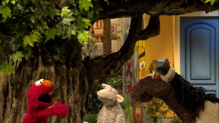 Elmo (links), Wolle (Mitte) und Pferd (rechts) überlegen, wie Elmo ins Baumhaus kommt.