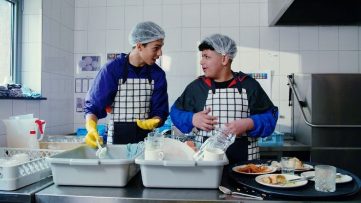 Omars (Ilias Admi, links) und Freund Illias' (Youssef Omri) erster Tag als Tellerwäscher. Doch lange können sie den Job nicht halten. © ZDF/Haegens Media - Honorarfreie Verwendung gemäß AGB im engen inhaltlichen redaktionellen Zusammenhang mit genannter Sendung bei Nennung "Bild: ZDF/Haegens Media" einschließlich Social Media Einschließlich Social Media© ZDF/Haegens Media - Honorarfreie Verwendung gemäß AGB im engen inhaltlichen redaktionellen Zusammenhang mit genannter Sendung bei Nennung "Bild: ZDF/Haegens Media" einschließlich Social Media Einschließlich Social Media
