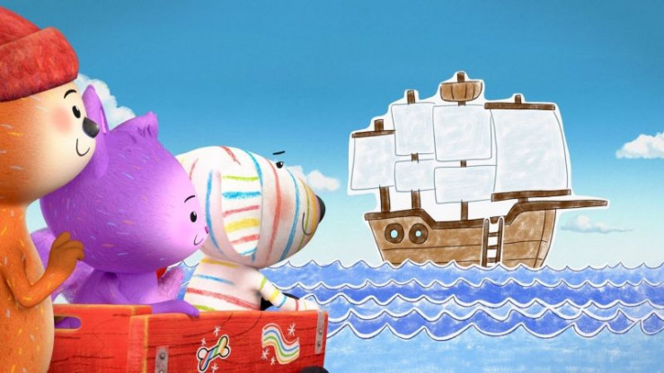Gemeinsam entdecken Dylan (rechts), Daisy (Mitte) und Ozzy (links) ihr Schiff, mit dem sie auf große Fahrt gehen wollen. © ZDF/2023 9 Story Media Group Inc. - Honorarfreie Verwendung im redaktionellen Zusammenhang mit genannter Sendung bei Nennung "Bild: ZDF/2023 9 Story Media Group Inc." einschließlich Social Media Einschließlich Social Media© ZDF/2023 9 Story Media Group Inc. - Honorarfreie Verwendung im redaktionellen Zusammenhang mit genannter Sendung bei Nennung "Bild: ZDF/2023 9 Story Media Group Inc." einschließlich Social Media Einschließlich Social Media