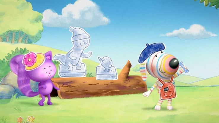 Bildhauer Dylan (rechts) ist ein echter Künstler: Stolz präsentiert er der noblen Käuferin Daisy (links) seine neuesten Werke - Skulpturen seiner Freunde Ozzy und Bitsy.