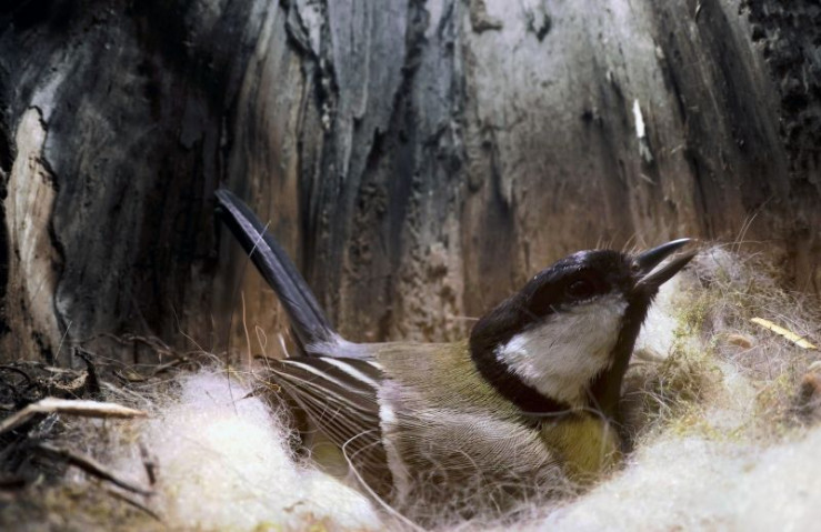 Brütendes Kohlmeisenweibchen in seinem Nest.