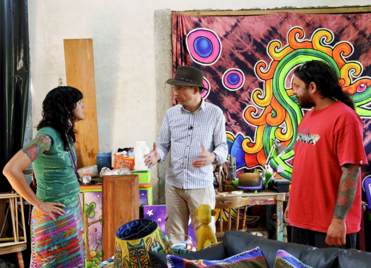 Reto Brennwald (M.) mit Wandmalerin Cristina Pineda (l.) in Ataco, El Salvador.