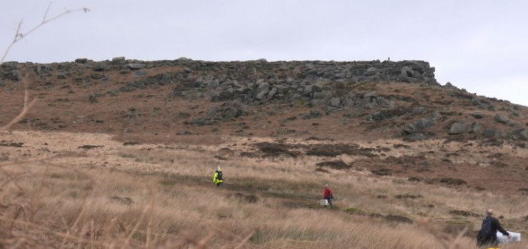 Carl Wark mit einem Fels und einer kraterartigen Vertiefung, die sich als Krater von Mörser-Übungen britischer Soldaten im Zweiten Weltkrieg erweist.