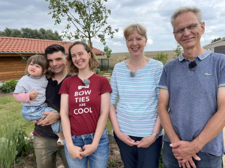 Zwei Garten- und Landschaftsbauer präsentieren einer Familie Konzepte für den Gartenumbau. Der Fokus liegt dabei auf günstigen Alternativen zu hochwertigen und teuren Baustoffen oder Pflanzen - zum Beispiel durch das Wiederverwerten vorhandener Materialien.