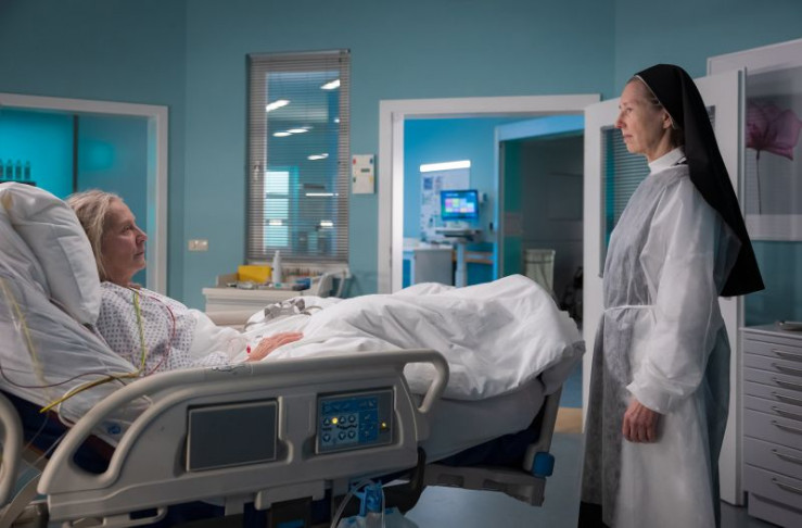 Schwester Klara (Petra Zieser, li.) bringt Schwester Johanna (Elisabeth Niederer, re.) nach einem Fahrradunfall in die Sachsenklinik.