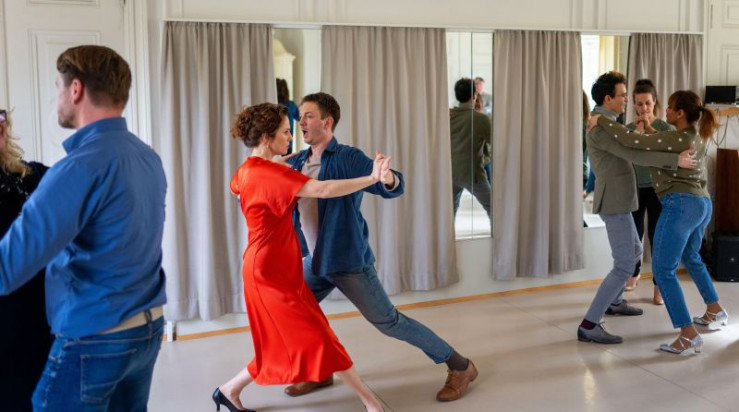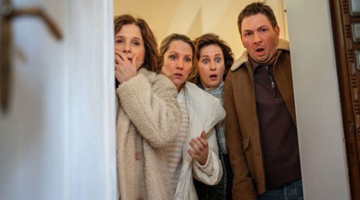 Werden Zeuginnen und Zeugen des "Hahnenkampfes": v.l.n.r. Renate (Victoria von Trauttmansdorff), Inka (Nikola Kastner), Doris (Marlene Morreis) und Nils (Johannes Kienast)