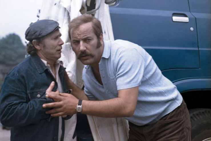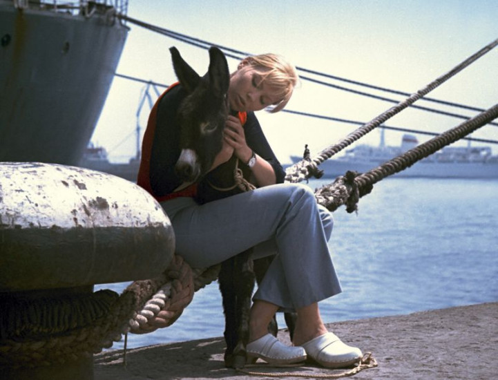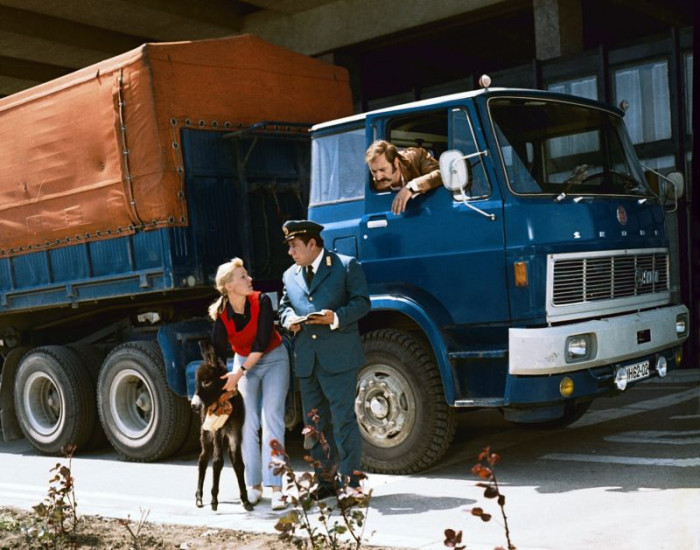 Beifahrerin Jana (Karla Chadimová) bekommt in Budapest einen Zwergesel geschenkt. Fernfahrer Fred (Manfred Krug, r.) ist genervt.