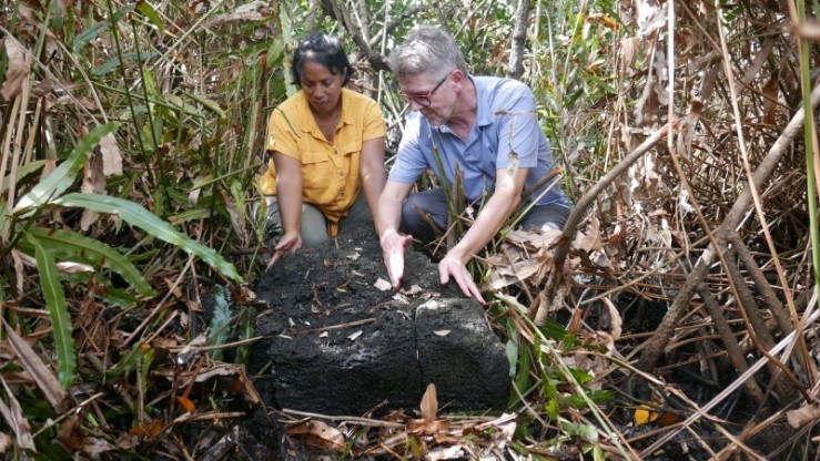 Jaschree Mungur-Medhi hat auf einer Mangroveninsel einen Markierungsstein entdeckt, dessen Spitze auf das gegenüberliegende Ufer weist.