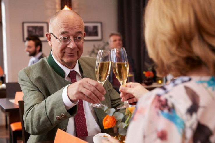 Achtziger (Alexander Duda, l.) und Marie (Karin Thaler, r.) stoßen auf das gelungene Programmheft an.