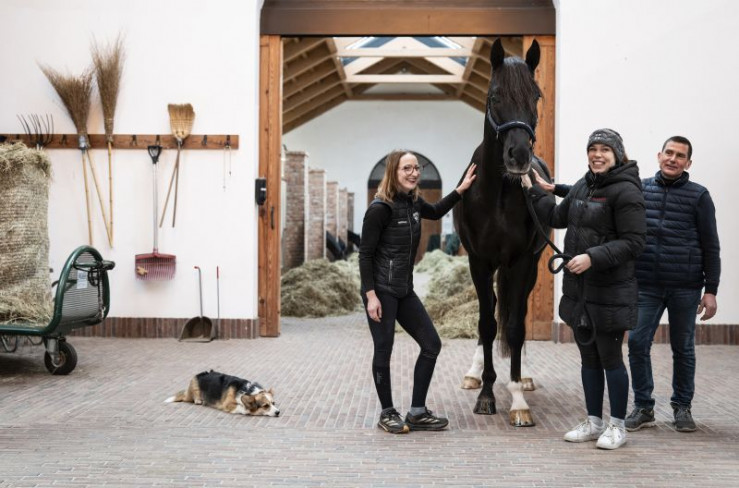 Wie der Herr des Hauses posiert der Junghengst auf Gut Schönweide mit seinen Zuarbeitern, die tagtäglich dafür sorgen, dass es ihm an Nichts fehlt.