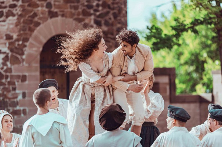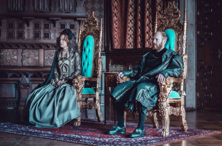 Als Polly bei der Trauerfeier zum Gedenken an den Prinzen ihre beiden Zofen (Julia Buchmann, Isabella Victoria Ginoccio) zum Lachen bringt, breitet sich dieses Lachen wie eine Lawine unter den Umstehenden aus. Der König kann dies nicht dulden - es kommt zum Streit und Polly geht.