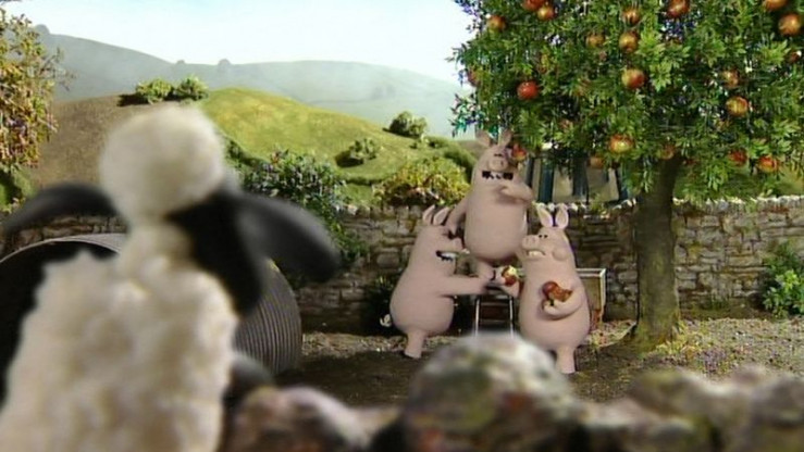 Die frechen Schweine erfreuen sich an einem mächtigen Apfelschmaus, der Apfelbaum neben ihrem Stall ist voll mit reifen, süßen Früchten. Davon hätten die Schafe auch gerne etwas ab und Shaun gibt das Anliegen höflich an die Schweine weiter. Die denken im Traum nicht daran, ihre Äpfel zu teilen. Und so muss Shaun erfinderisch werden. Dank seiner ausgeklügelten Ernteidee landen schließlich sogar alle Äpfel auf der Schafsweide und die Schweine gucken ins Leere.