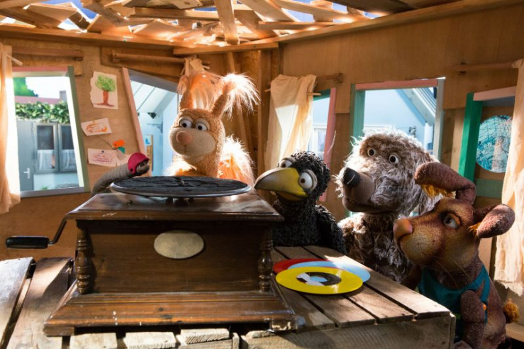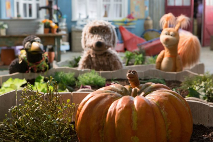 Alle rätseln, wie Wurm Lotti ihren Schluckauf endlich loswerden kann. V.l.n.r.: Rabe Rudi (Lennart Morgenstern), Hofhund Buffo (Ulli Voland), Wurm Lotti (Heide Evers), Eichhörnchen Ella (Anna Menzel) © ZDF/Zia Ziarno - Honorarfreie Verwendung gemäß AGB im redaktionellen Zusammenhang mit genannter Sendung bei Nennung "Bild: ZDF/Zia Ziarno" einschließlich Social Media Einschließlich Social Media© ZDF/Zia Ziarno - Honorarfreie Verwendung gemäß AGB im redaktionellen Zusammenhang mit genannter Sendung bei Nennung "Bild: ZDF/Zia Ziarno" einschließlich Social Media Einschließlich Social Media