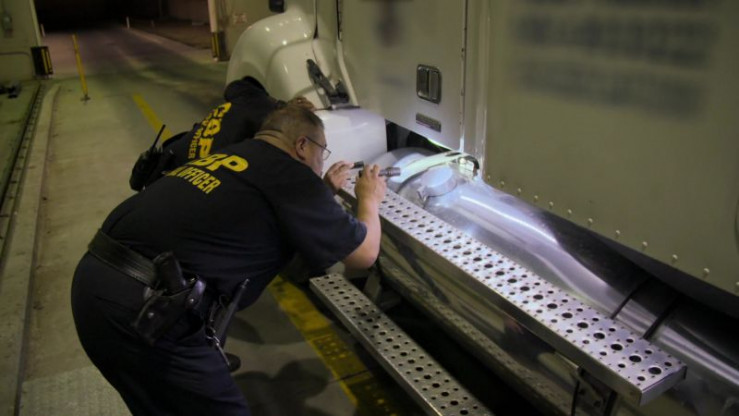 Ein Grenzschutzbeamter kontrolliert einen LKW akribisch. Jedes Detail wird geprüft, um Schmuggelware und illegale Transporte aufzudecken.