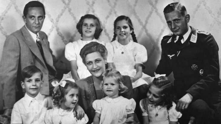 Auf dem Familienportrait sind Joseph und Magda Goebbels mit ihren sechs gemeinsamen Kindern Helga, Hildegard, Helmut, Holdine, Hedwig und Heidrun zu sehen. Daneben, rechts im Bild, sitzt Harald Quandt, Magdas erwachsener Sohn aus erster Ehe.