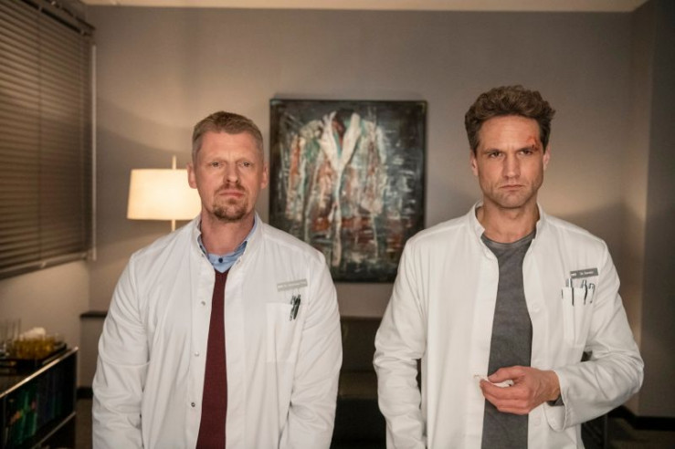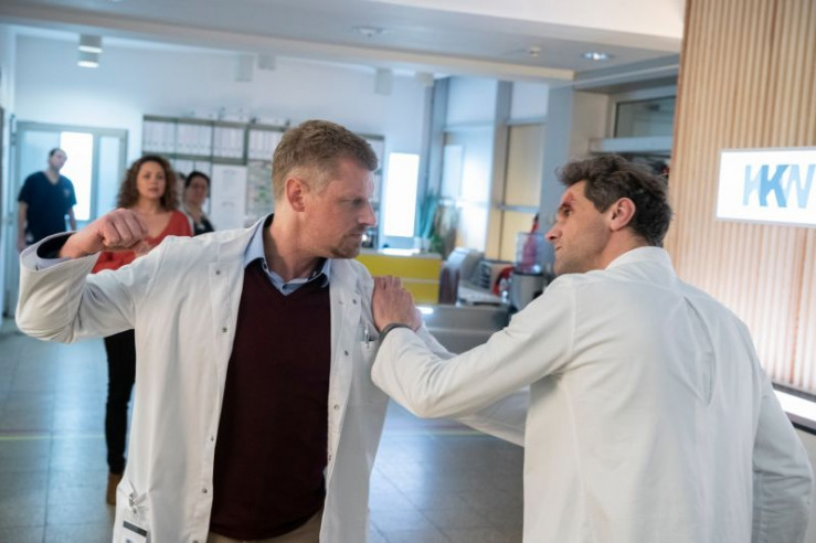 Zwischen den beiden Oberärzten Matthias Fink (Martin Gruber, l.) und Dr. Sebastian Sander (Oliver Franck) kommt es zu einem handfesten Streit.