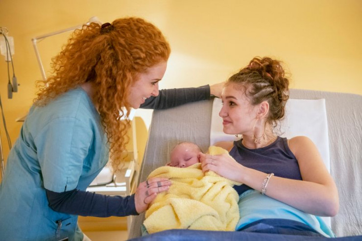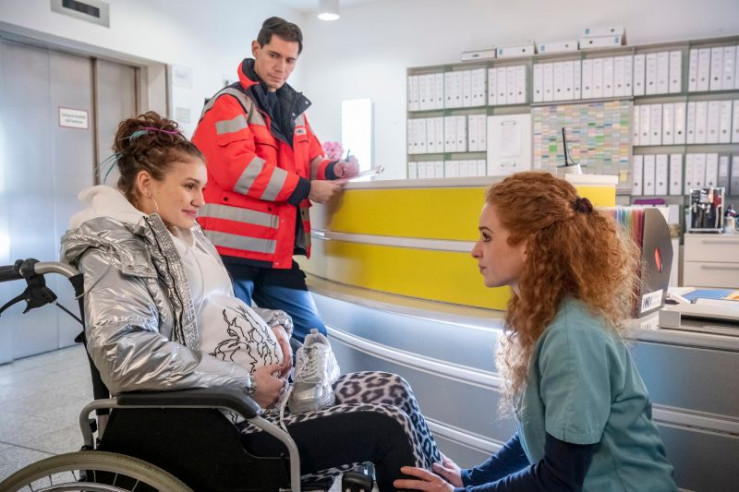 Hanna (Valerie Eisenbart, r.) hat ihre Tochter (Olivia Eleni Angelie, M.) unerwartet zur Welt gebracht, obwohl sie eigentlich wegen ihres Fußes eingeliefert wurde. Ihre große Schwester Meike (Sarah Hannemann) ist heilfroh, dass es beiden gut geht.